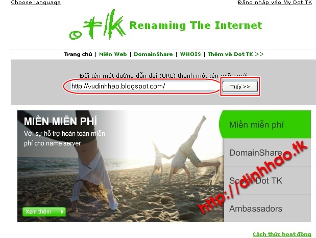 Các bạn nhập URL trang Web hoặc Blog của mình mà các bạn muốn rút ngắn thành tên miền.tk vào ô cửa sổ rồi bấm nút: Tiếp >>